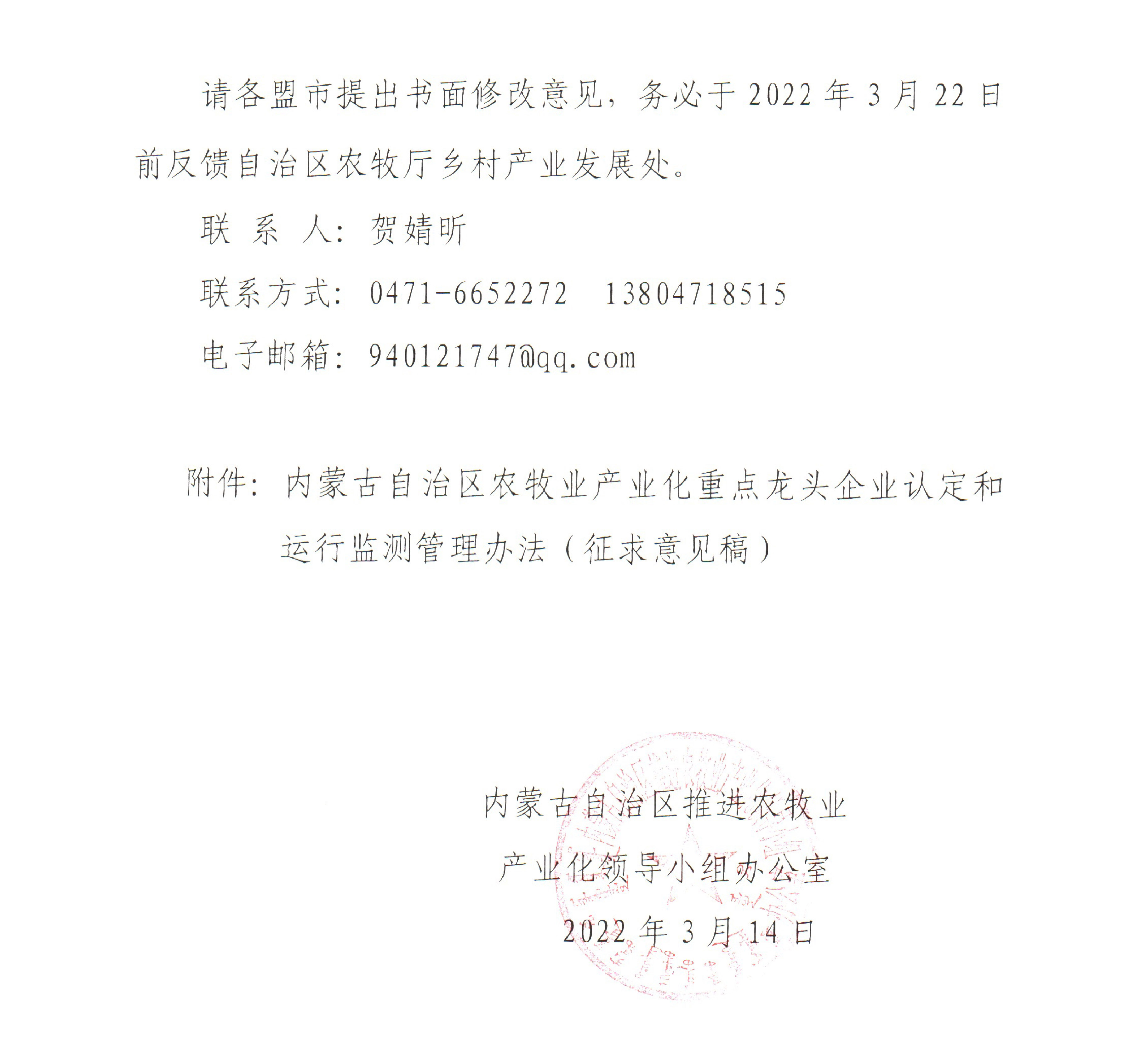 標題:關于征求修訂《內(nèi)蒙古自治區(qū)農(nóng)牧業(yè)產(chǎn)業(yè)化重點龍頭企業(yè)認定和運行監(jiān)測管理辦法(征求意見稿)》修改意見的函
