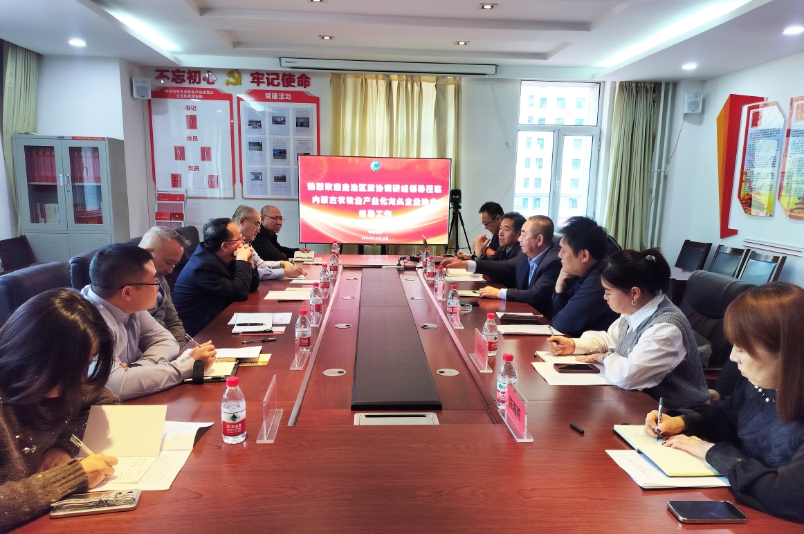 2024年12月18日下午,自治區(qū)政協(xié)委員、港澳臺僑聯(lián)絡和外事委員會主任張波,內(nèi)蒙古工業(yè)大學僑聯(lián)副主席新巴雅爾,內(nèi)蒙古航空職業(yè)技術學校校長、內(nèi)蒙古航空運動協(xié)會會長趙自強,自治區(qū)政協(xié)港澳臺僑聯(lián)絡和外事委員會辦公室主任安勝利一行6人來協(xié)會調(diào)研指導工作,協(xié)會副會長單位內(nèi)蒙古凌志馬鈴薯科技股份有限公司總經(jīng)理閆洪志、內(nèi)蒙古民豐種業(yè)有限公司劉榮書,常務理事單位內(nèi)蒙古額爾敦羊業(yè)股分有限公司董事長助理畢欣及協(xié)會秘書處全體工作人員參加會議,會議由協(xié)會秘書長呼群主持。