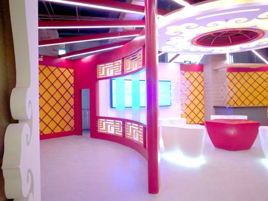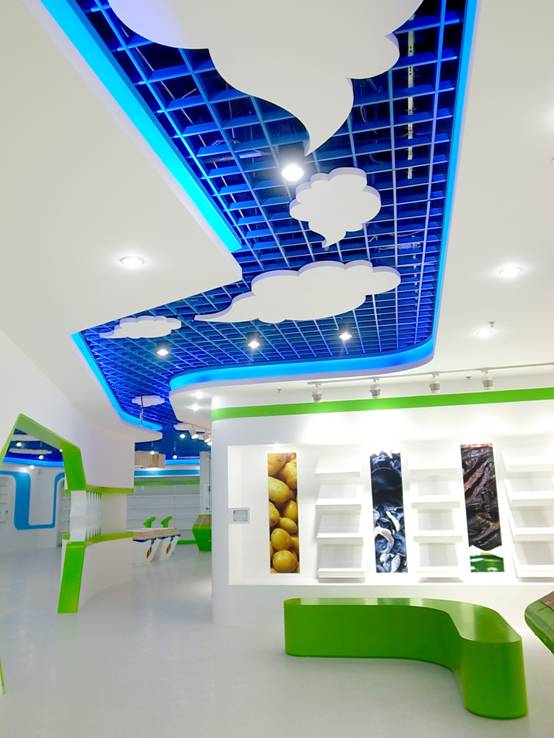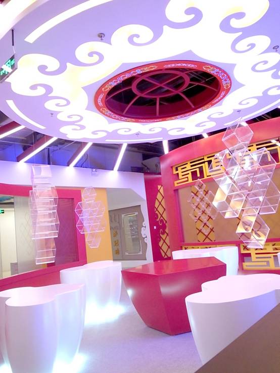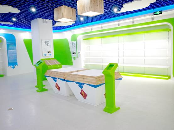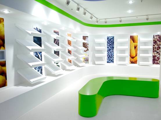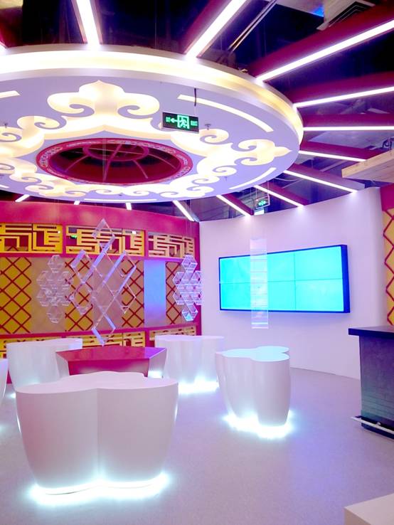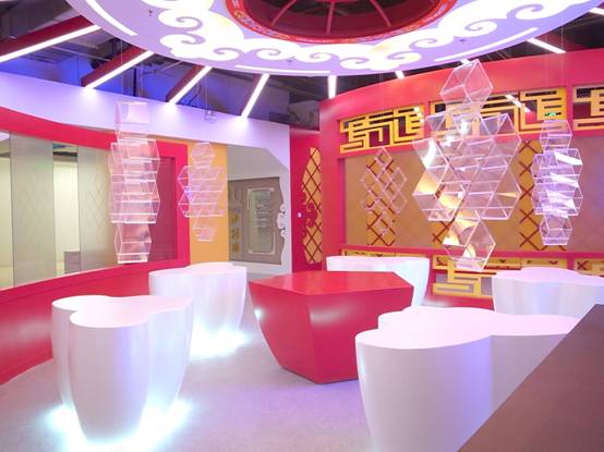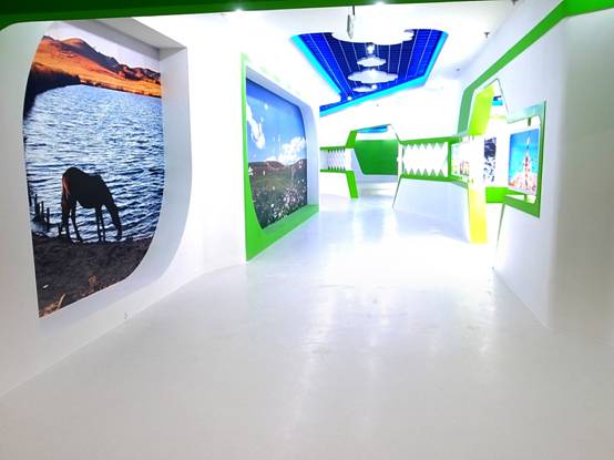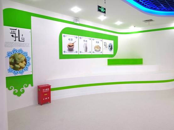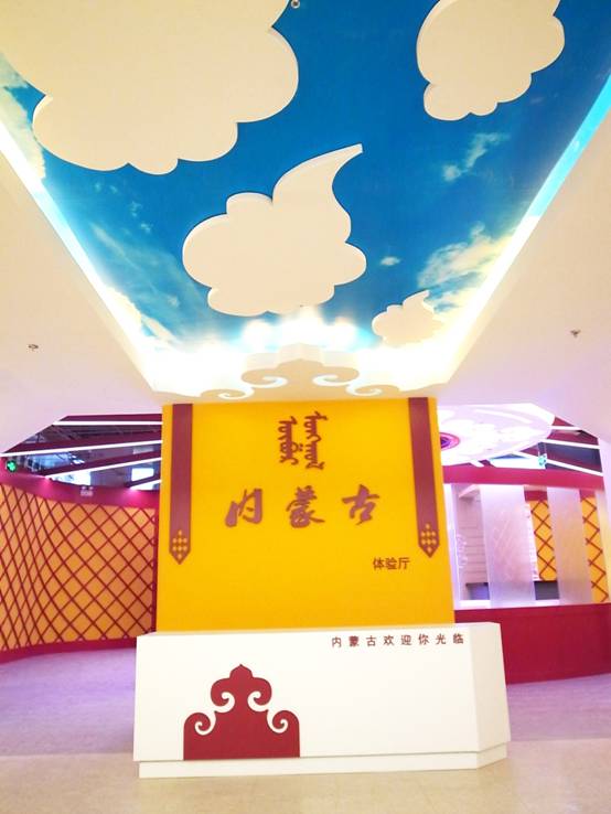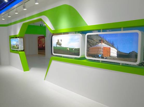 : 上海西郊國(guó)際內(nèi)蒙古館現(xiàn)場(chǎng)實(shí)景圖,現(xiàn)場(chǎng)分為展示區(qū)和體驗(yàn)區(qū),展示區(qū)以產(chǎn)品展示銷售為主,現(xiàn)代科技結(jié)合時(shí)尚展廳設(shè)計(jì)風(fēng)格,藍(lán)綠白相結(jié)合,映襯藍(lán)天、白云、草原;體驗(yàn)區(qū)突出體驗(yàn)品嘗、商務(wù)洽談功能,以現(xiàn)代蒙古包造型設(shè)計(jì),突出民族氣息,展現(xiàn)內(nèi)蒙古特色。