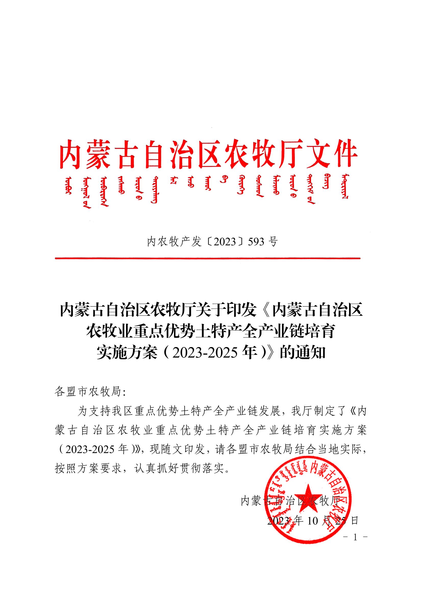 標(biāo)題:內(nèi)蒙古自治區(qū)農(nóng)牧廳關(guān)于印發(fā)《內(nèi)蒙古自治區(qū) 農(nóng)牧業(yè)重點(diǎn)優(yōu)勢(shì)土特產(chǎn)全產(chǎn)業(yè)鏈培育 實(shí)施方案(2023-2025年)》的通知