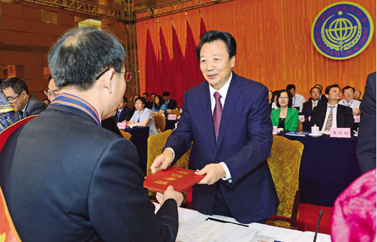 5月29日上午,自治區(qū)黨委書(shū)記王君在自治區(qū)科協(xié)第七次代表大會(huì)上,為榮獲“第九屆內(nèi)蒙古自治區(qū)青年科技獎(jiǎng)”和“首屆內(nèi)蒙古自治區(qū)科技標(biāo)兵”稱(chēng)號(hào)的代表頒獎(jiǎng)。記者袁永紅攝